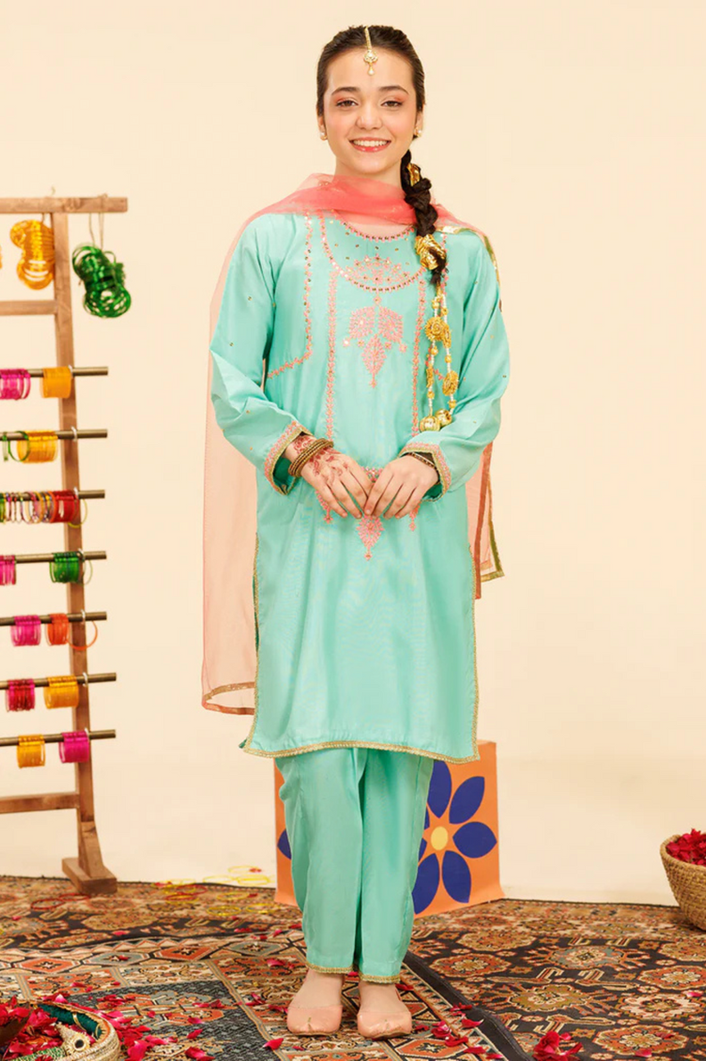 Paired with a classic shalwar, this outfit stays true to the traditional South Asian aesthetic, ensuring both comfort and grace. The lightweight net dupatta completes the look with a soft, ethereal charm, making your little one stand out effortlessly.